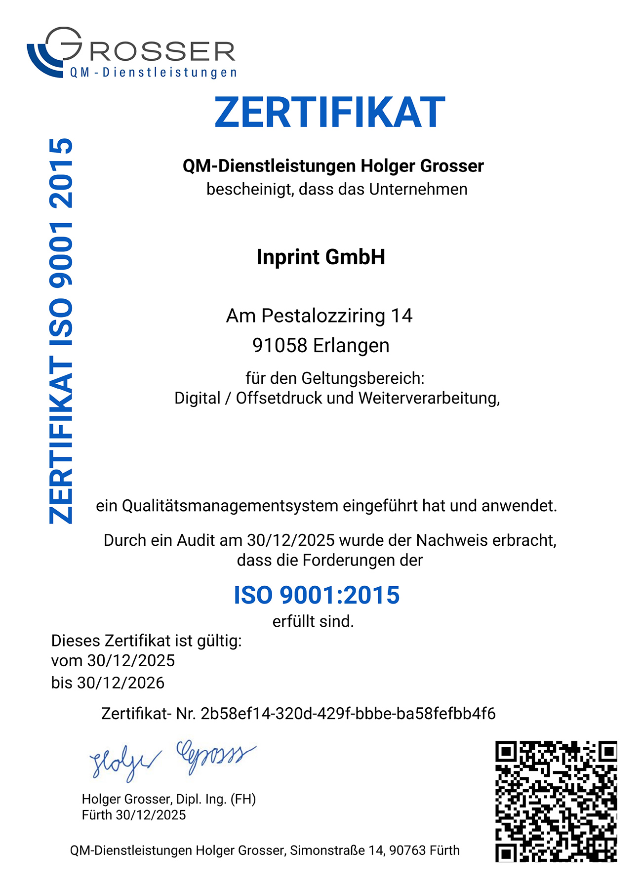 Als nach DIN ISO 9001 zertifizierte Druckerei arbeiten wir nach einem geprüften und kontinuierlich überwachten Qualitätsmanagementsystem. Klare Prozesse, definierte Verantwortlichkeiten und regelmäßige Kontrollen sorgen dafür, dass Ihre Druckaufträge zuverlässig, effizient und in gleichbleibend hoher Qualität umgesetzt werden. Die Zertifizierung bestätigt unseren Anspruch, Qualität nicht dem Zufall zu überlassen.
